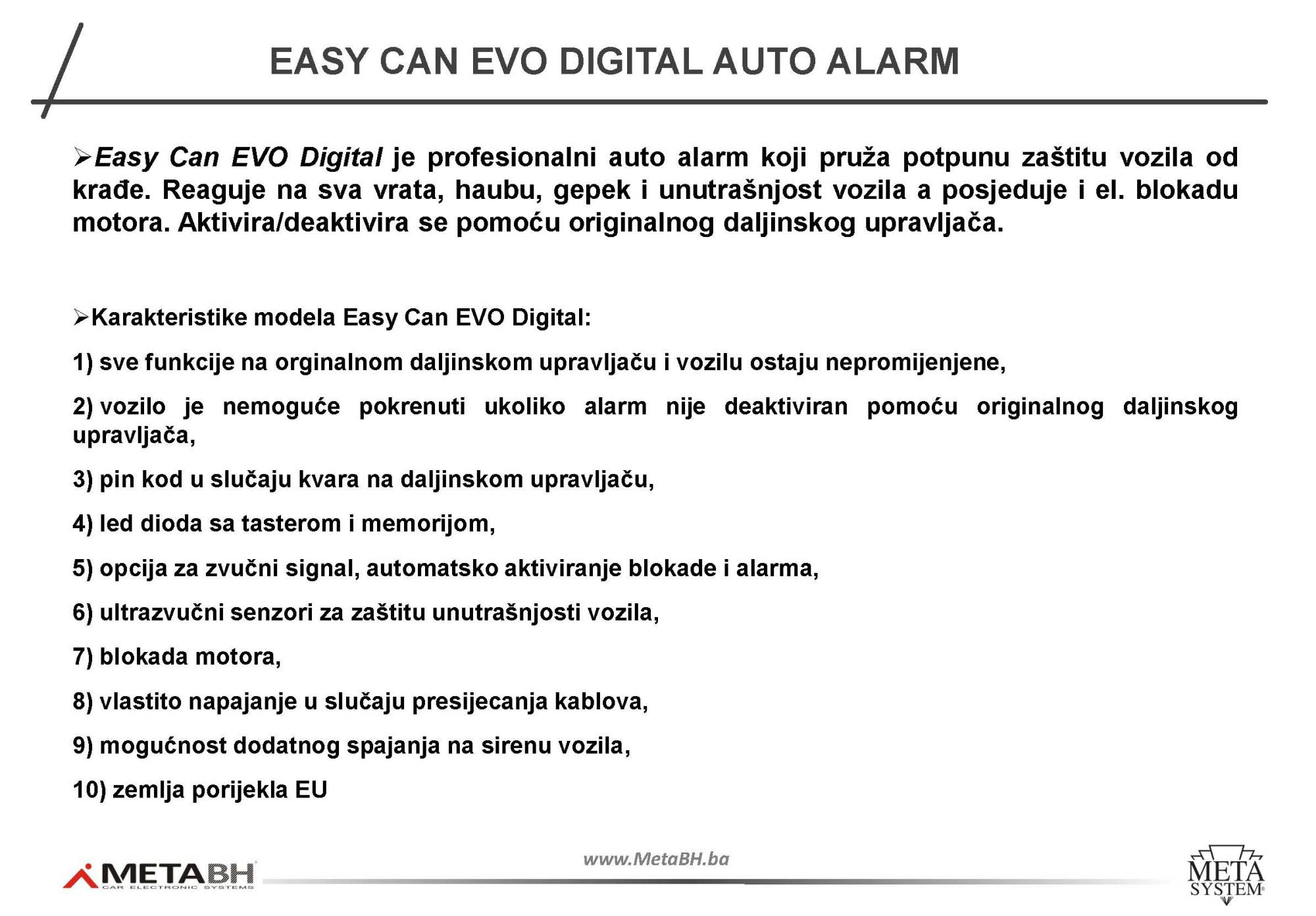 Alarmni sistem sa sirenom (vlastito napajanje), senzorima za unutrašnju zaštitu i blokadom motora namijenjen za vozila sa originalnim daljinskim zaključavanjem. Easy Can EVO Digital komunicira sa vozilom putem CAN BUS signala.
