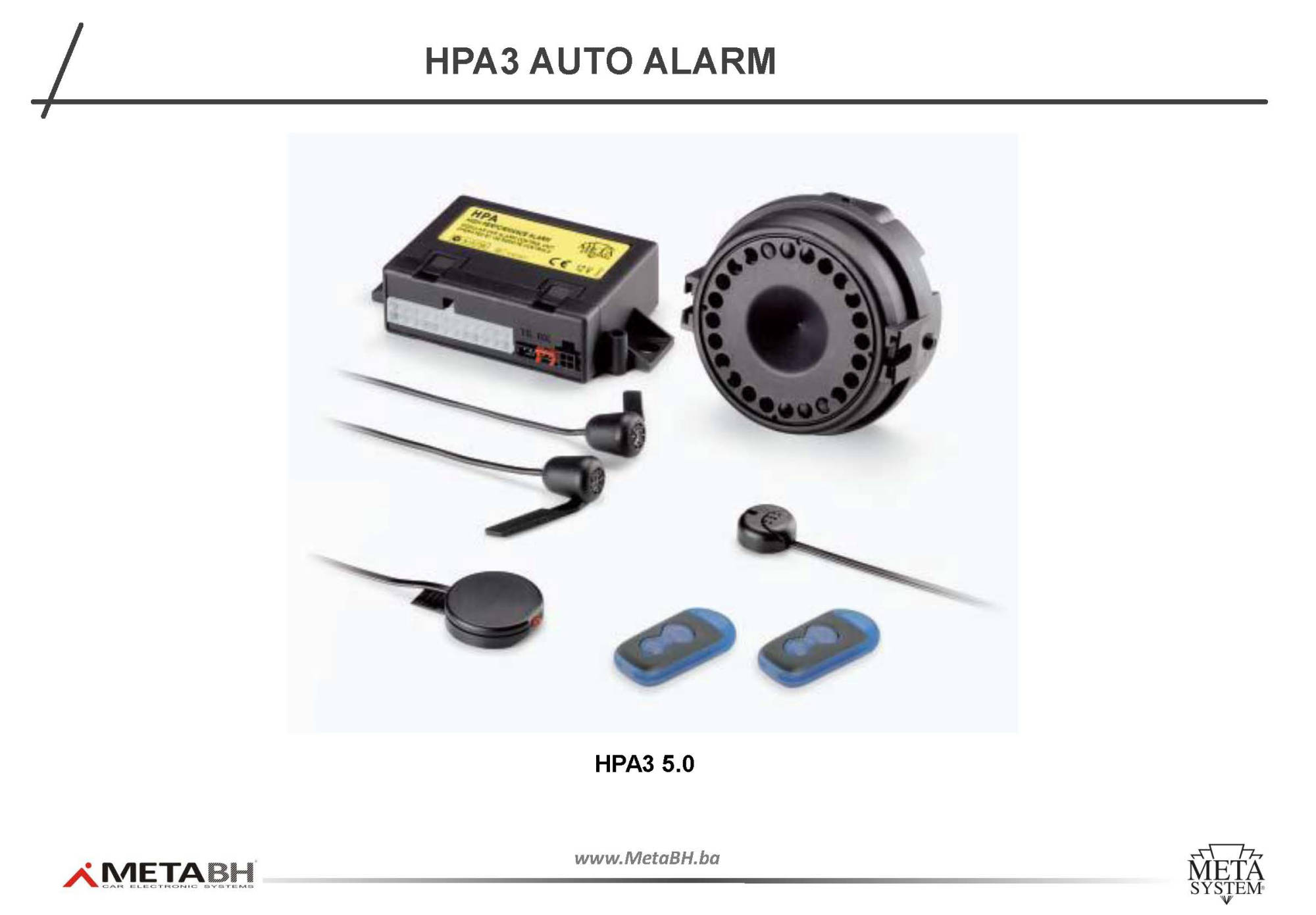 Alarmni sistem sa sirenom (vlastito napajanje), senzorima za unutrašnju zaštitu i blokadom motora namijenjen za vozila koji nemaju vlastito daljinsko zaključavanje. HPA3 je kontroliran sa vlastitim daljinskim upravljačima.